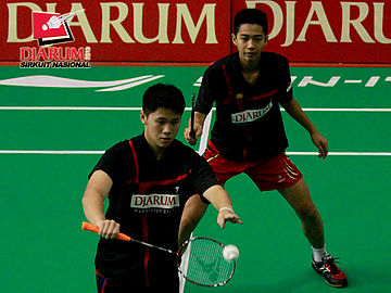 Abu Bakar / Tedi Supriadi (Djarum Kudus) mengembalikan smash lawan.