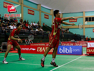 Arsya Isnanu Ardi Putra/Yantoni Edy Saputra (Djarum Kudus) serve.