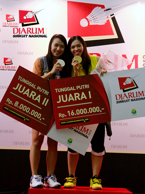 Rena Arsela (djarum Kudus) mengembalikan kok ke arah Fitriani (Exist Jakarta).