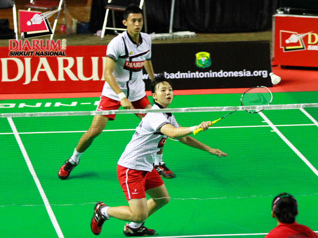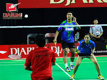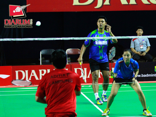Abu Bakar/Febriani Endar (PB Djarum) bersiap menyambar pengembalian dari Aldo Abdillah/Desaula Gendi (Pusdiklat Jaya Raya).