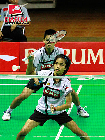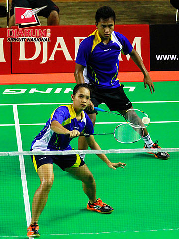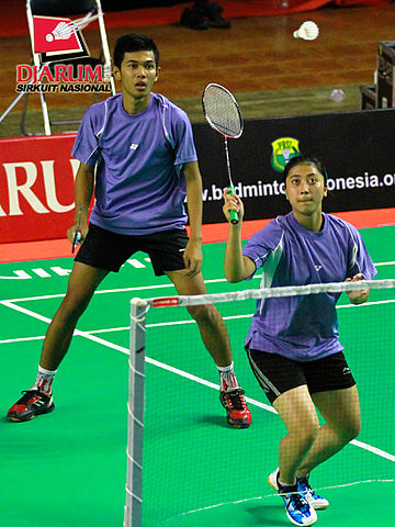 Rian Swastedian/Masita Mahmudin (Pusdiklat Jaya raya) mengembalikan kok ke arah Sabar Karyaman/Shinta Dwi (Exist).