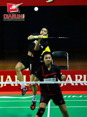 Fajar Alfian/Inte Ratnasari (SGS PLN) bersiap menyambar pengembalian tanggung dari Viky Anindita/Defanya Ruth (Tangkas Specs).