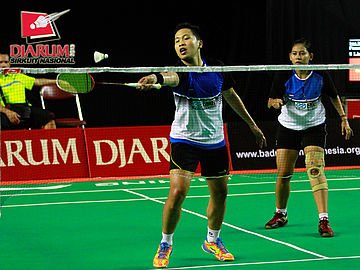 Ricky Alverino/Uswatun Khasanah (PB Djarum) melepaskan smash ke arah pasangan Willian Astan/Sellawati Tarunijaya (Exist).