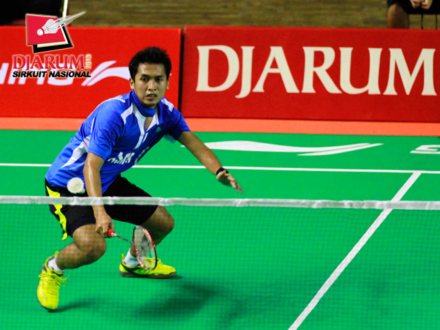 Fauzi Adnan (Jaya Raya Suryanaga) mengembalikan shuttlecock ke arah Yogi Irvans (Angkasa Prestasi).