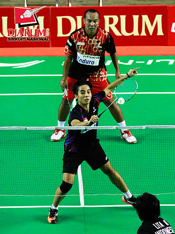 Garry Lam (Exist) menyambut serve dari Bandar Sigit (Sarwendah).