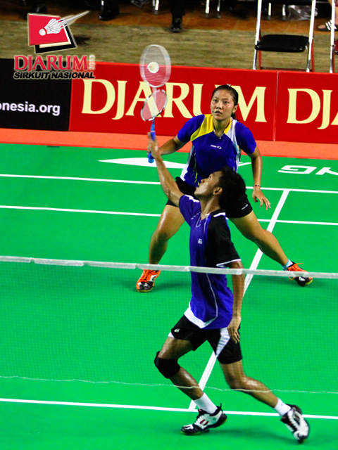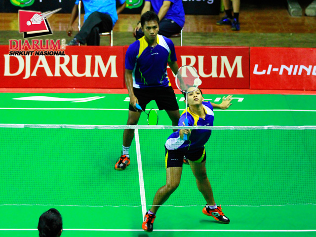 Trikus Haryanto/Nadya Melati (Pertamina) mengembalikan shuttlecock ke arah pasangan Dwi Setiawan/Lita Nurlita (Tsunami/SGS PLN).