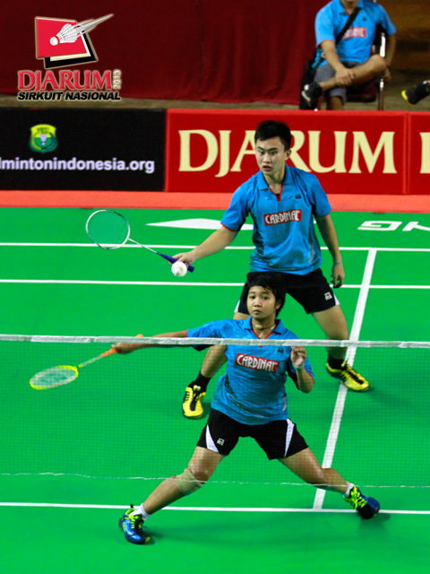 Reinard/Shinta Arum (Mutiara Bandung) mengembalikan kok ke arah pasangan Tedi Supriadi/Della Agustia (PB Djarum).