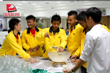 Sejumlah atlet Jaya Raya Suryanaga saat mengantre mengambil minuman.
