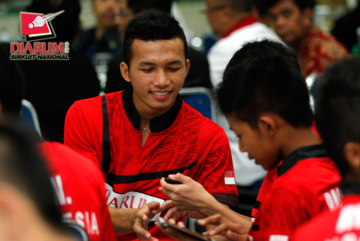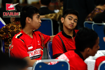 M. Revindra Reyhaldi (PB Djarum) terlihat bercanda dengan rekannya saat Welcome Party Djarum Sirkuit Nasional Sumatera Utara Open 2013 di Aula Martabe, perkantoran Gubernur Sumatera Utara, Medan.