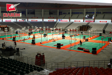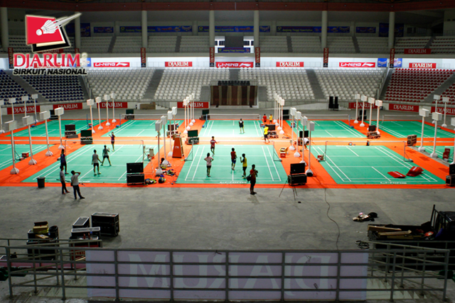 Suasana Gedung Serbaguna dengan sepuluh lapangan yang dipersiapkan untuk Djarum Sirkuit Nasional Sumatera Utara Open 2013, Medan.