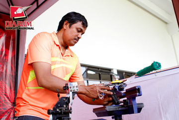 Salah satu pekerja di booth Li-Ning sedang memperbaiki raket.