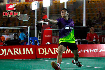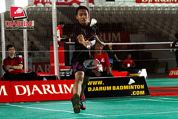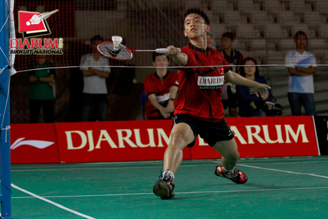 Taufik Hidayat (Indocafe Medan) berusaha mengembalikan shuttlecock ke arah Handoko (PB Alwaslyah).