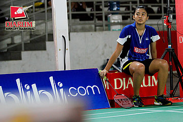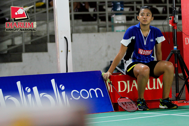 Mayrina Lukmanda (Mutiara Bandung) saat beristirahat sebelum memulai set kedua.