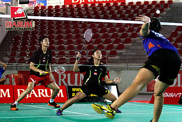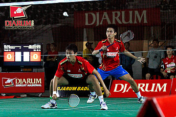 Abu Bakar/Tedi Supriadi (PB DJarum) bersiap menyambut pengembalian dari pasangan Clinton Hendrick/Rian Ardianto (Jaya Raya).