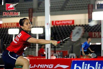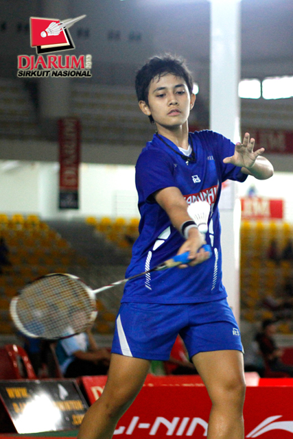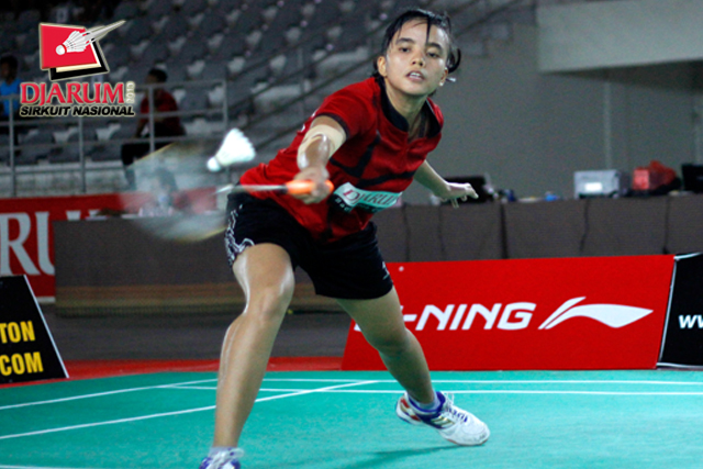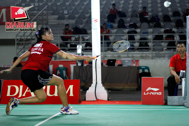 Arinda Sari Sinaga (PB Djarum) mengembalikan shuttlecock ke arah Elizabeth Matindas (SGS PLN).