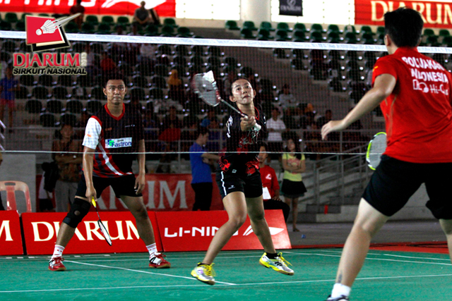 Ardiansyah Putra/Devi Tika Permatasari (Pertamina Indonesia/SGS PLN) mengembalikan shuttlecock ke arah pasangan Chrisna Adi/Natalia Poluakan (Halim/Hi Qua Wima).