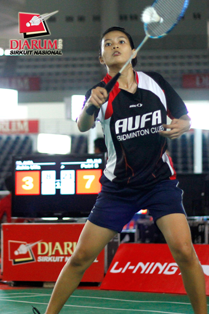Rifa Putri (PB Djarum) bersiap mengembalikan shuttlecock ke arah Febtria Adisthya (Mutiara Bandung).