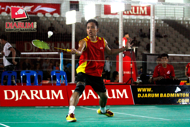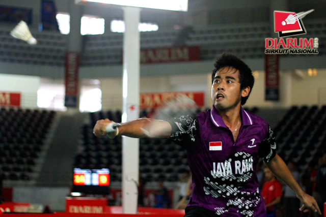 Fauzi Adnan (Jaya Raya Suryanaga) berhasil menghadang serangan yang dilepaskan Reksy Aureza (PB Djarum).