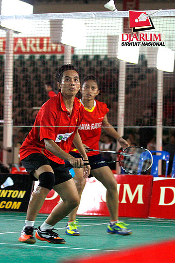 Dian Fitriani/Nadya Melati (Jaya Raya/Pertamina Indonesia) bersiap mengembalikan shuttlecock ke arah Deariska Putri/Nurbeta Kwanrico (PB Djarum).