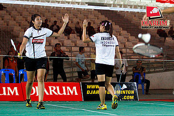 Chintia Rhizta/Ristya Ayu (PB Djarum) mengembalikan shuttlecock ke arah Afni Fadilah/Putri Sekartaji (Indocafe Medan/Mutiara Bandung).