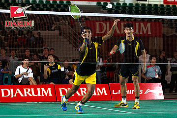 Fauzi Adnan (Jaya Raya Suryanaga) mengembalikan shuttlecock ke arah Hermansyah (Jaya Raya).