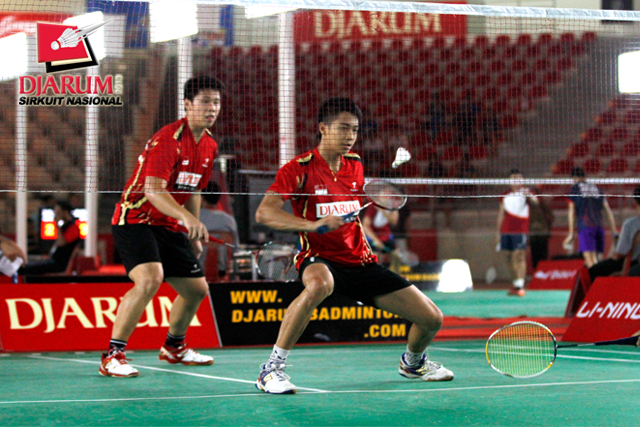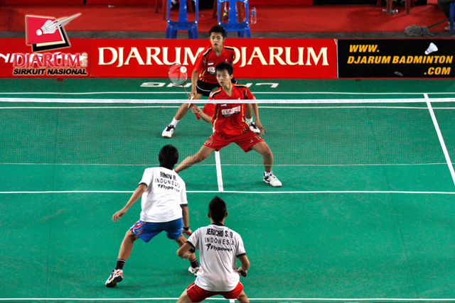 Jerico See/Rinov Rivaldy (PB Djarum) bersiap menghadang serangan yang dilepaskan pasangan Dicky Cahya/Rifky Nur Alam (PB Djarum).