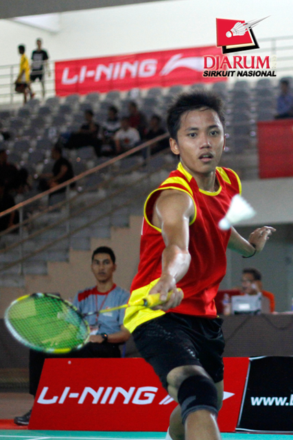 Alwi Mahardika/Felix Eka (Exist) menyambar serve dari pasangan Hantoro/Ricky Alverino (PB Djarum).