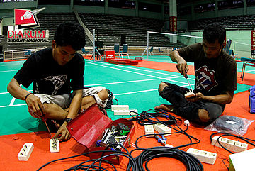 Salah satu anggota tim Live Score saat memasang perangkat kerjanya.