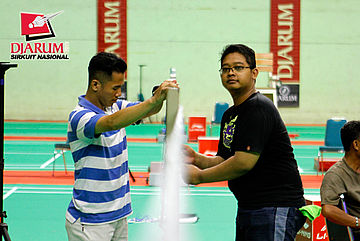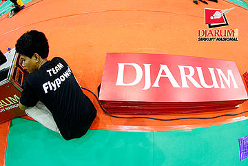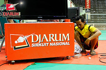 Salah satu pekerja siap memasangkan papan Djarum di pinggir lapangan pertandingan.