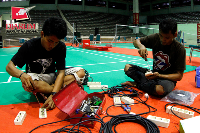 Salah seorang pekerja sedang memasang papan Djarum Sirkuit Nasional di bawah layar live score.