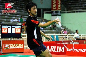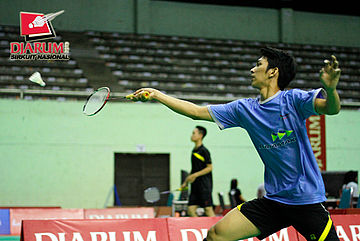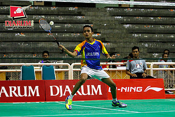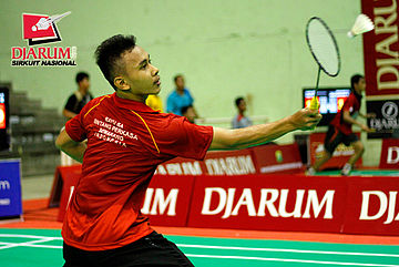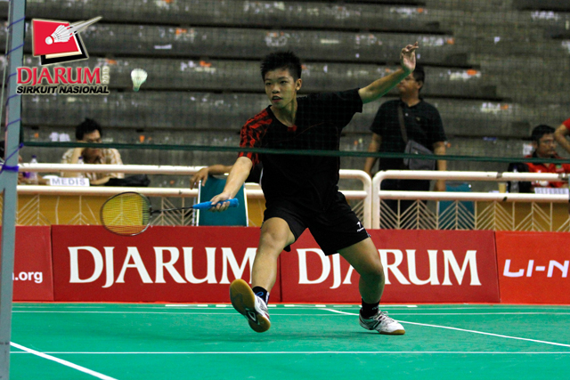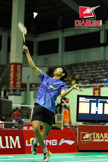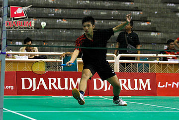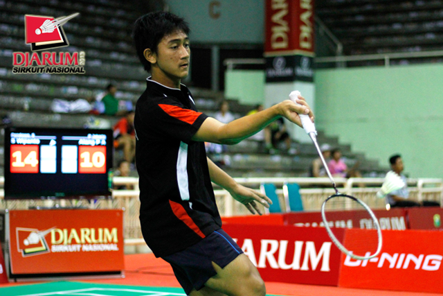Alang Panji (Pertamina Indonesia) mengembalikan shuttlecock ke arah Syaherdillah Wijianto (Pendowo).