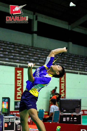 Taufan Fadli (Candra Wijaya) mengembalikan shuttlecock ke arah Ridwan Arista (Pertamina Indonesia).