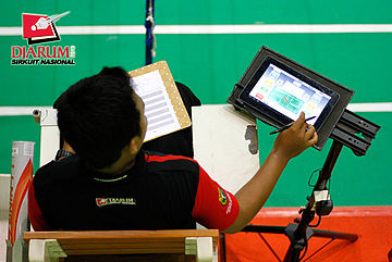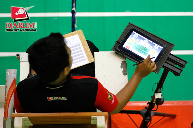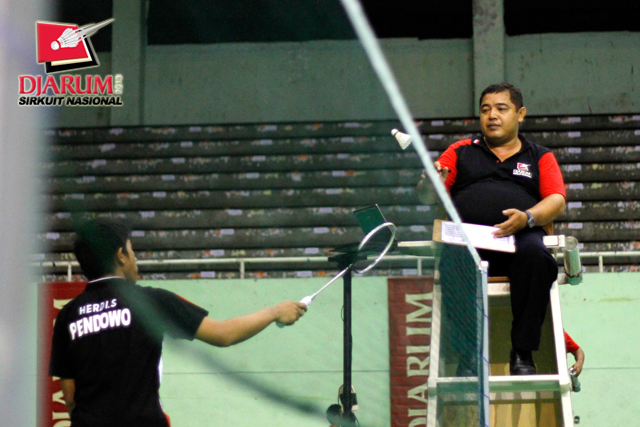 Wasit memberikan shuttlecock kepada Syaherdillah Wijianto (Pendowo).