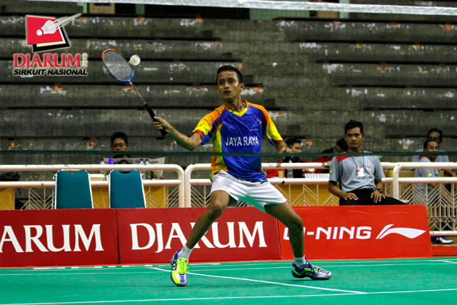 Akbar Bayu (Bintang Perkasa) mengembalikan shuttlecock ke arah Andry Ilmiawan (Jaya Raya Az Zikra).