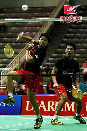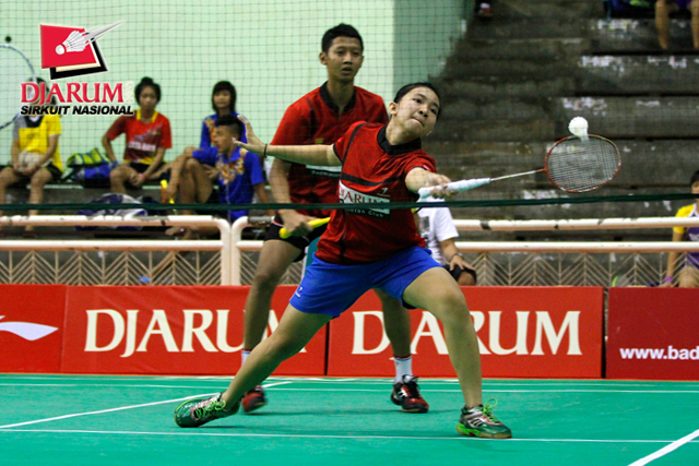 M. Febriansyah/Cynthia Shara (PB Djarum) menyambar pengembalian tanggunga dari M. Wildan/Annisa Syifarani (PPLP Jakarta/Jaya Raya Az Zikra).