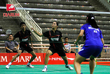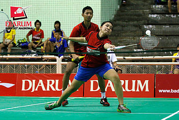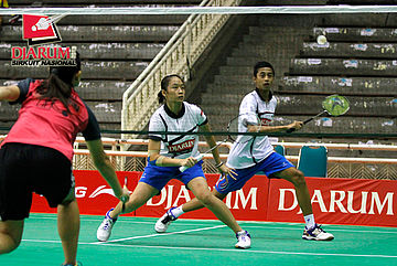 Akbar Gusti/Felicia Parmenas (PB Djarum) berusaha menggapai pengembalian dari pasangan Yusrizal Sanusi/Agnes Siena (Hi Qua Wima).