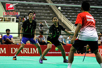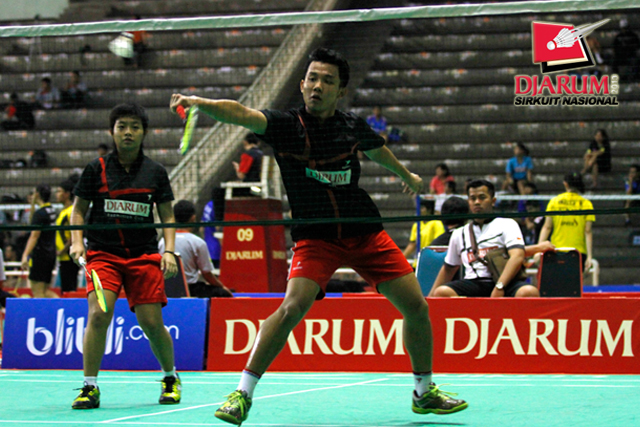 M. Febriansyah/Cynthia Shara (PB Djarum) mengembalikan shuttlecock ke arah M. Wildan/Annisa Syifarani (PPLP Jakarta/Jaya Raya Az Zikra).
