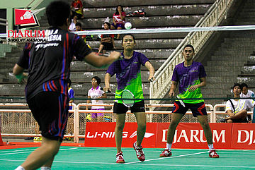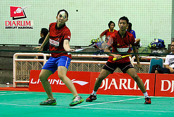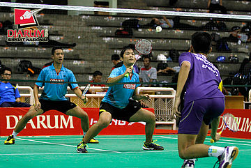 Andika Ramadiansyah/Masheilla Gischa (PB Djarum) bersiap menyambut pengembalian dari Ilham/Monica Insany (Mutiara Bandung).