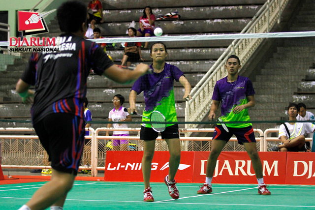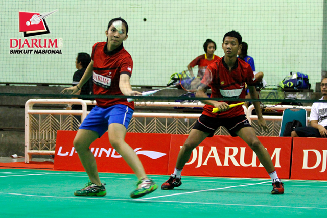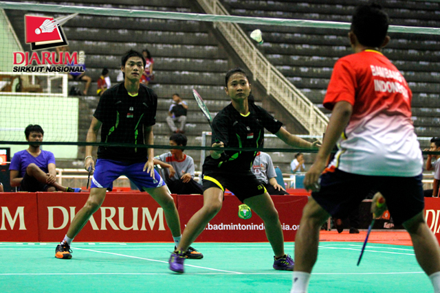 Akbar Gusti/Felicia Parmenas (PB Djarum) bersiap menggapai pengembalian dari pasangan Yusrizal Sanusi/Agnes Siena (Hi Qua Wima).