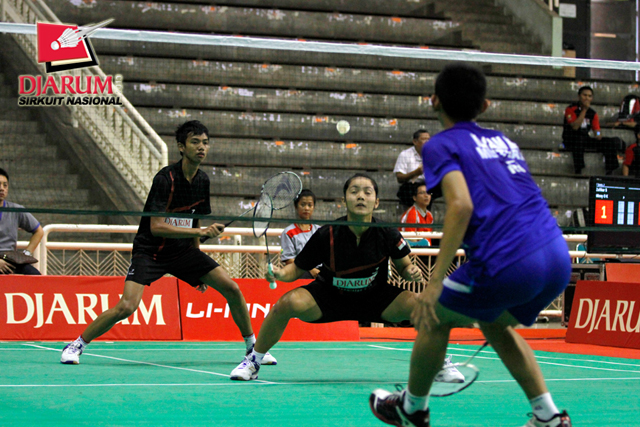 Galang Decky/Mychelle Chrystine (PB Djarum) mengembalikan shuttlecock ke arah Aji Firmansyah/Bunga Fitriani (Mutiara Bandung).