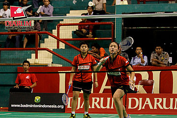 Agdevika Rochmadani S/Rifa Putri A (DJARUM) mencoba menggapai shuttlecock.