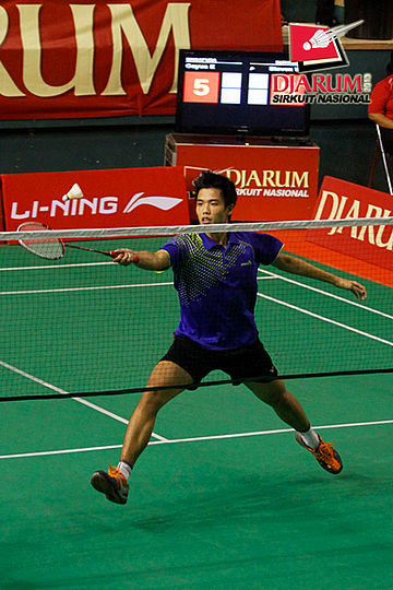 Gayus Elputra (SINGAPURA) mencoba menggapai shuttlecock.