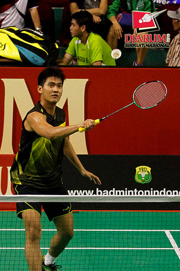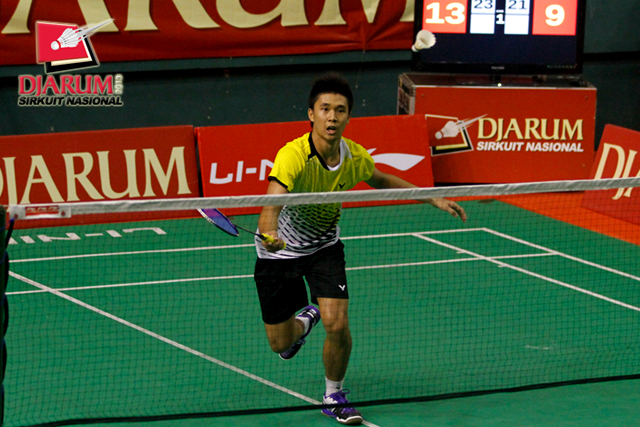 Kaesar Bobby Alexander (ANUGERAH JAKARTA)mengembalikan shuttlecock ke arah Achmad Mahmud Anasafy (PTP MANDIRI).