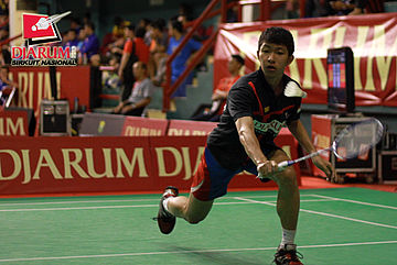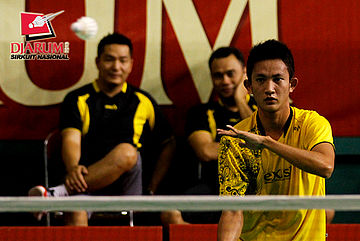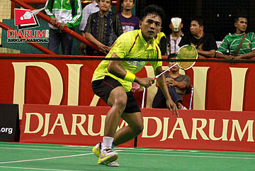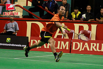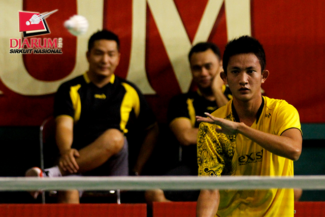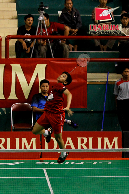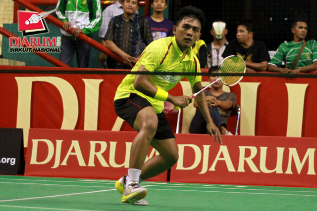 Indar Setiawan (PERTAMINA) mengembalikan shuttlecock ke arah Jeffer Rosobin (ROSOBIN).