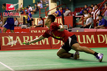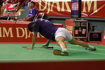 Endrue Tampi (TANGKAS SPECS) terjatuh saat mencoba menggapai shuttlecock.