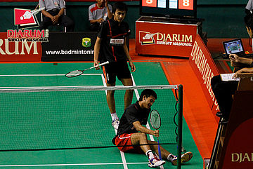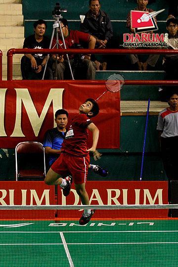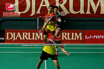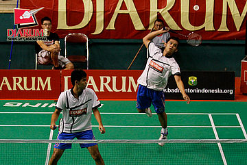 Jeka Wiratama/Vicky Rizky Pratama (DJARUM) jumping smash.