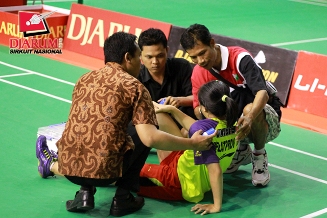 Michelle Tania (PELATPROV BALI) mendapatkan perawatan medis karena cidera lutut.