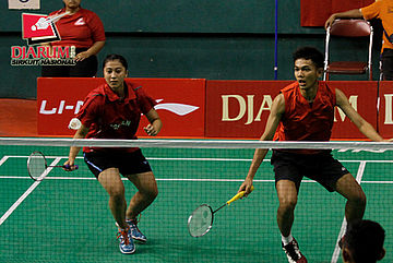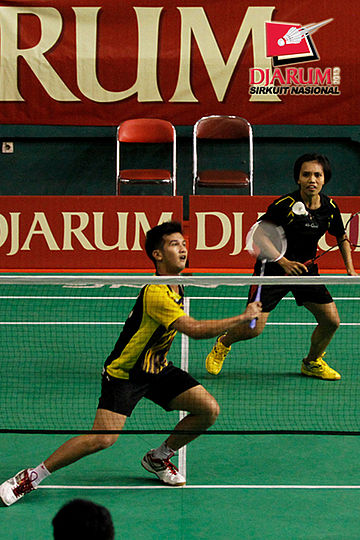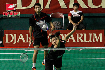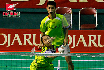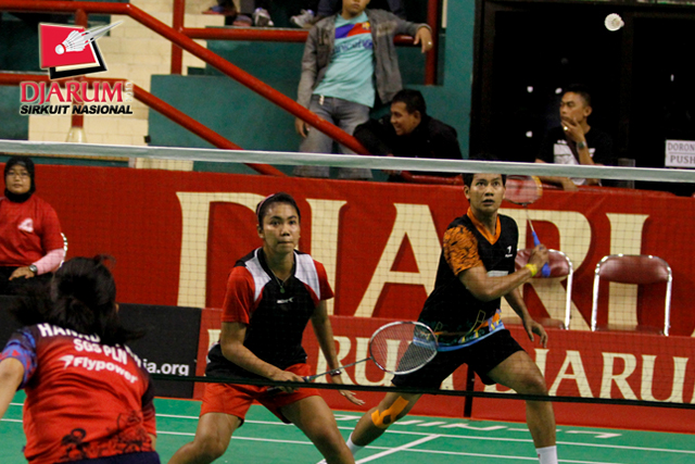 Hidayat Setiawan/Rusydina Antardayu Riodingin (TANGKAS SPECS) menyambar pengembalian tanggung Rahmat Adianto/Nurbeta Kwanrico (DJARUM)