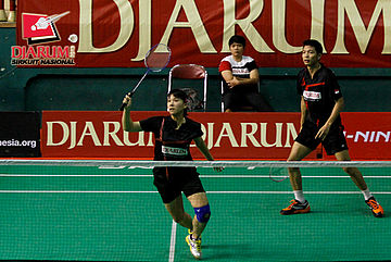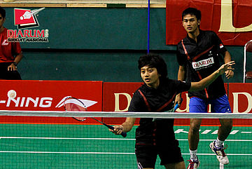 Achmad Rivai/Aris Budiharti (BANK SUMSEL/JAYA RAYA JAKARTA) mengantisipasi arah datangnya shuttlecock