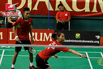 Fajar Alfian/Inten Ratnasari (SGS PLN) berusaha menggapai shuttlecock